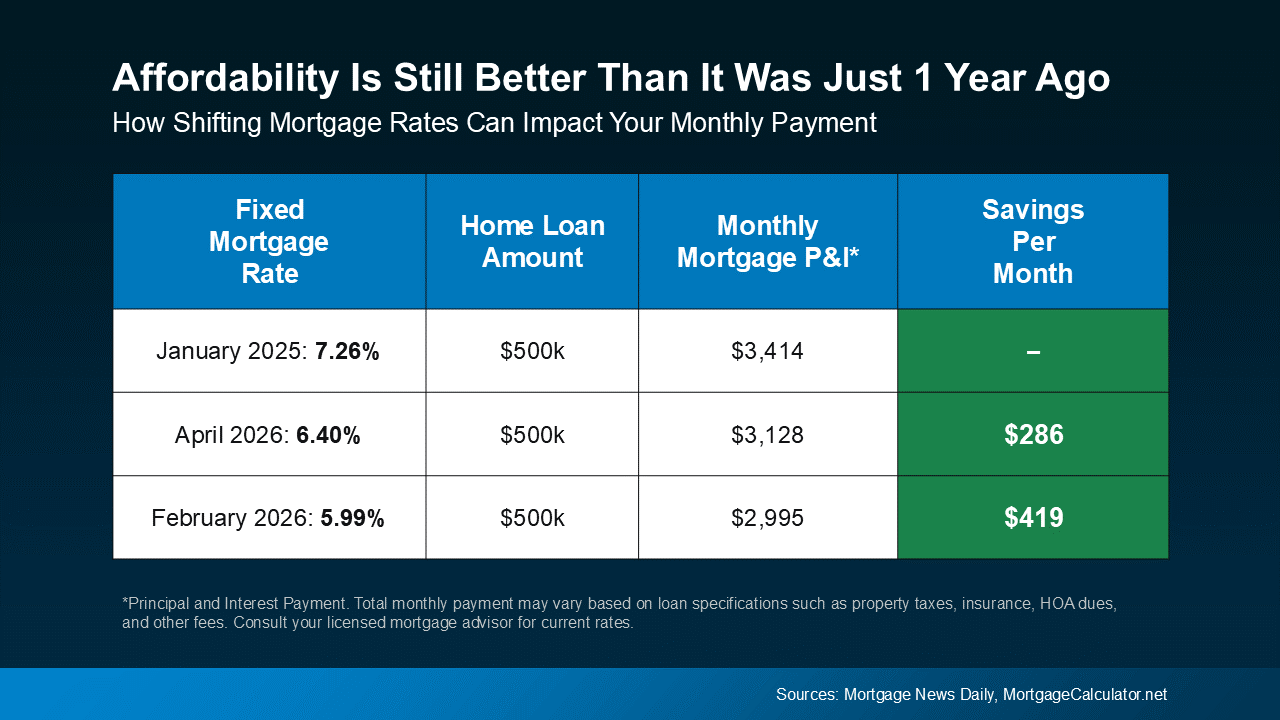 That means this recent increase in rates hasn’t erased the progress we’ve seen. Buying is still more affordable than it was just one year ago (see below):